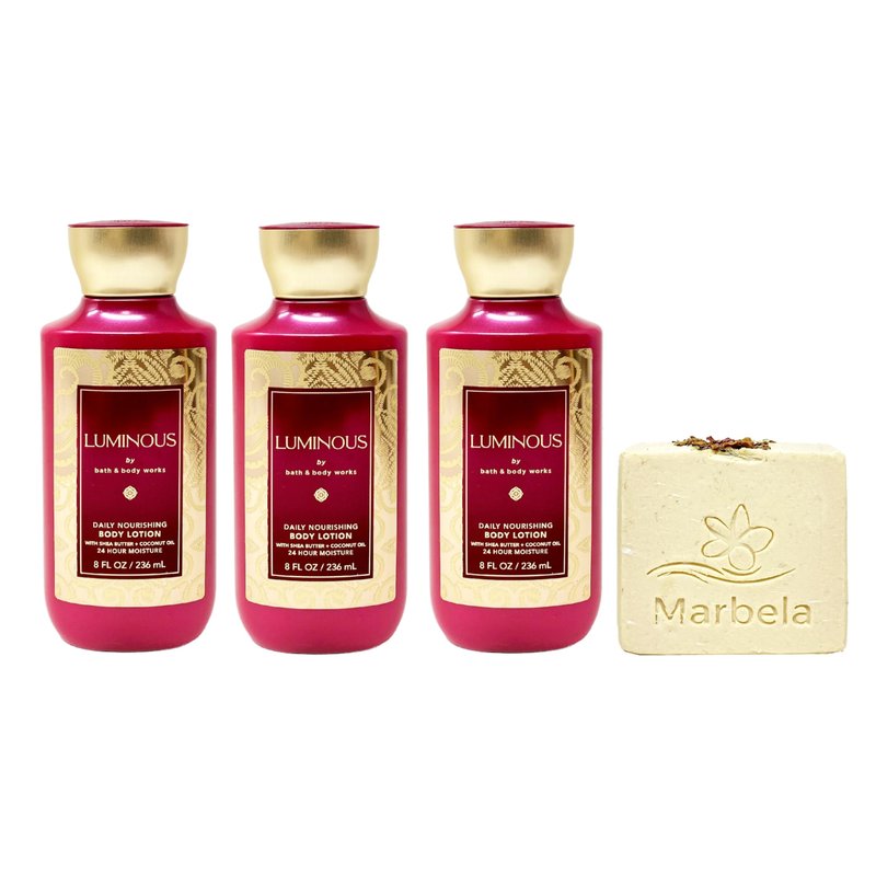 Bath & Body Works Luminous Daily Nourishing Body Lotion Gift Set with a Marbela Creamy Rose Bar Soap. INCLUDES: 3 Daily Nourishing Body Lotions (8 fl oz / 236 mL each) and a 4 oz Marbela Creamy Rose Bar Soap. Luminous - What it smells like: radiant, decadent and sparkling. Marbela Creamy Rose Bar Soap - You have come to the right place. Roses and oats combine to create a sweet and delicate scrub that works to gently exfoliate.The creaminess of the soap dually moisturizes and smoothens. Scent: Gentle Roses and Ylang Ylang Essential Oil.