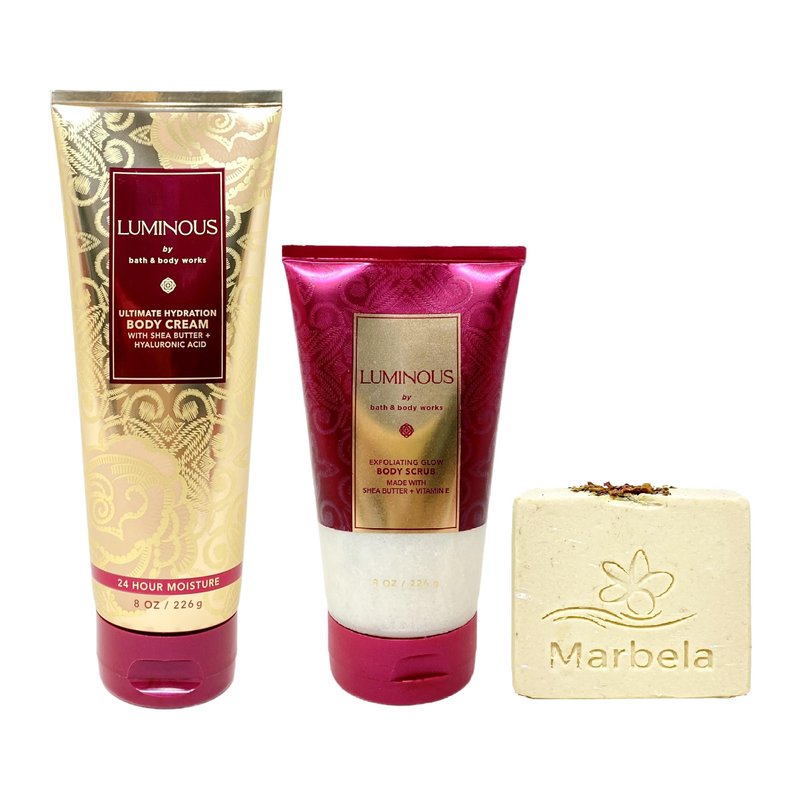 Bath & Body Works Luminous 2 Piece Gift Set with a Marbela Creamy Rose Bar Soap. INCLUDES: 8 oz / 226 g Ultimate Hydration Body Cream, 8 oz / 226 g Exfoliating Glow Body Scrub, and a 4 oz Marbela Creamy Rose Bar Soap. Luminous - What it smells like: radiant, decadent and sparkling. Marbela Creamy Rose Bar Soap - You have come to the right place. Roses and oats combine to create a sweet and delicate scrub that works to gently exfoliate.The creaminess of the soap dually moisturizes and smoothens. Scent: Gentle Roses and Ylang Ylang Essential Oil.