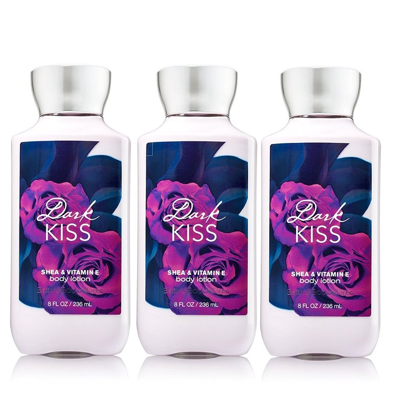Bath & Body Works Dark Kiss (3 Pack) Daily Nourishing Body Lotion 8 Oz. What it smells like: a sweet, seductive night in. Fragrance notes: black raspberry, burgundy rose, bergamot incense, dark vanilla bean and plum musk. What it does: provides 24 hours of nourishing moisture and leaves skin feeling noticeably softer after one use. Why you'll love it: Infused with the good stuff (vitamin E, shea butter and coconut oil), Lightweight texture absorbs quickly, Made without parabens or artificial dyes, Dermatologist tested, Bottle made with 50% recycled plastic. (Packaging may vary)