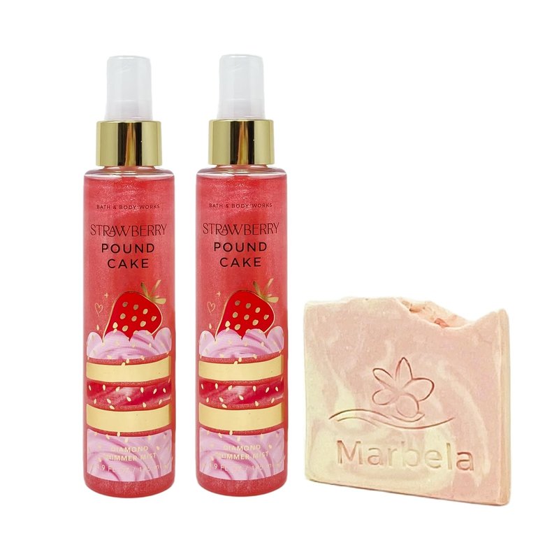 Bath & Body Works Strawberry Pound Cake Diamond Shimmer Mist Set with a Marbela Himalayan Salts Springs Sample Soap. INCLUDES: 2 Diamond Shimmer Mists (4.9 fl oz / 146 mL each) and a 4 oz Marbela Himalayan Salts Springs Sample Soap (Soap May Vary). Strawberry Pound Cake - What it smells like: fruity and mouth-wateringly sweet. Fragrance notes: fresh strawberries, golden shortcake and whipped cream. Marbela Himalayan Salts Springs Soap - Himalayan salts help hydrate and nourish the skin, with its water absorbent properties. These minerals are known to be helpful for acne, irritated and dry skin. Himalayan Salt Springs soap has natural kaolin clay blended to further moisturize and hydrate your body. Scent: Citrusy Florals with Litsea Cubeba Essential Oil.