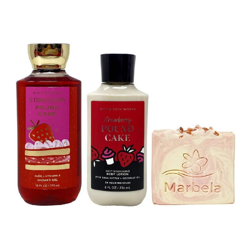 Bath & Body Works Strawberry Pound Cake 2 Piece Set with a Marbela Himalayan Salts Springs Bar Soap. INCLUDES: 8 fl oz / 236 mL Daily Nourishing Body Lotion, 10 fl oz / 295 mL Shower Gel, and a 4 oz Marbela Himalayan Salts Springs Bar Soap. Strawberry Pound Cake - What it smells like: fruity and mouth-wateringly sweet. Fragrance notes: fresh strawberries, golden shortcake and whipped cream. Marbela Himalayan Salts Springs Soap - Himalayan salts help hydrate and nourish the skin, with its water absorbent properties. These minerals are known to be helpful for acne, irritated and dry skin. Himalayan Salt Springs soap has natural kaolin clay blended to further moisturize and hydrate your body. Scent: Citrusy Florals with Litsea Cubeba Essential Oil.
