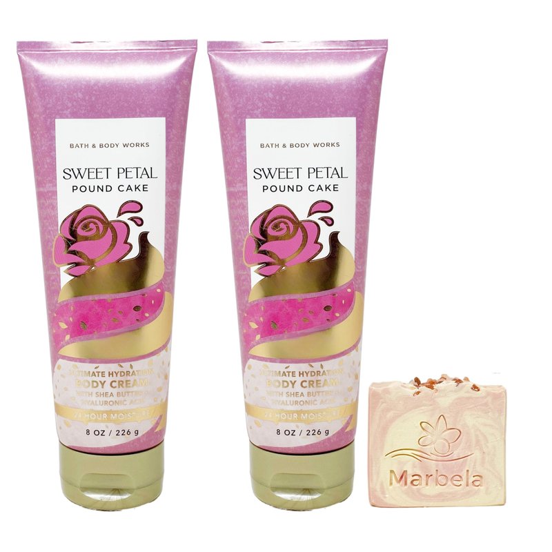 Bath & Body Works Sweet Petal Pound Cake - 2 pack of Ultimate Hydration Body Cream with a Marbela Himalayan Salts Springs Bar Soap. (Marbela Soap May Very)