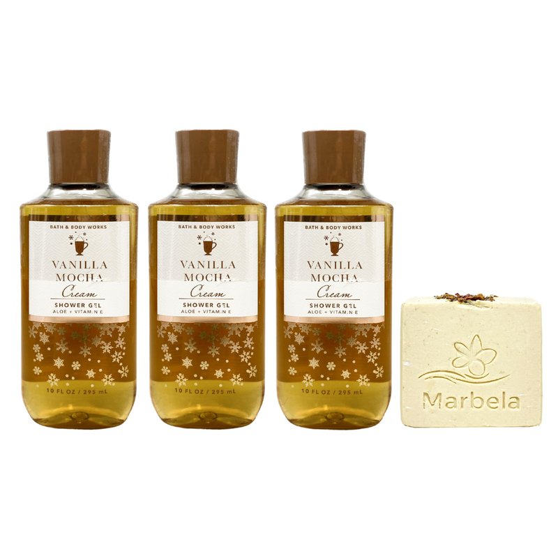 Bath & Body Works Vanilla Mocha Cream Shower Gel Value Pack with a Marbela Creamy Rose Bar Soap. INCLUDES: 3 Shower Gels (10 fl oz / 295 mL each) and a Marbela Creamy Rose Bar Soap. Vanilla Mocha Cream - Fragrance Notes: A sweet, creamy mug of cozy cappuccino, vanilla orchid and white tonka bean. Marbela Creamy Rose Soap - You have come to the right place. Roses and oats combine to create a sweet and delicate scrub that works to gently exfoliate.The creaminess of the soap dually moisturizes and smoothens. Scent: Gentle Roses and Ylang Ylang Essential Oil.