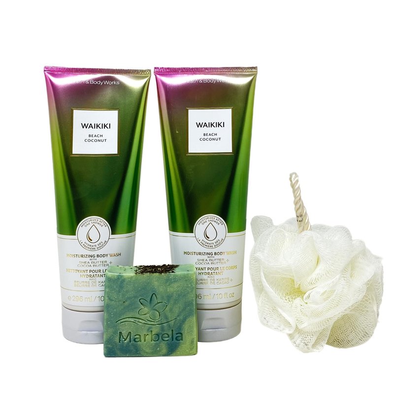 Bath and Body Works Waikiki Beach Coconut 2 Moisturizing Body Wash Set with a Fresh Forest Bar Soap and a Shower Sponge - Full Size
