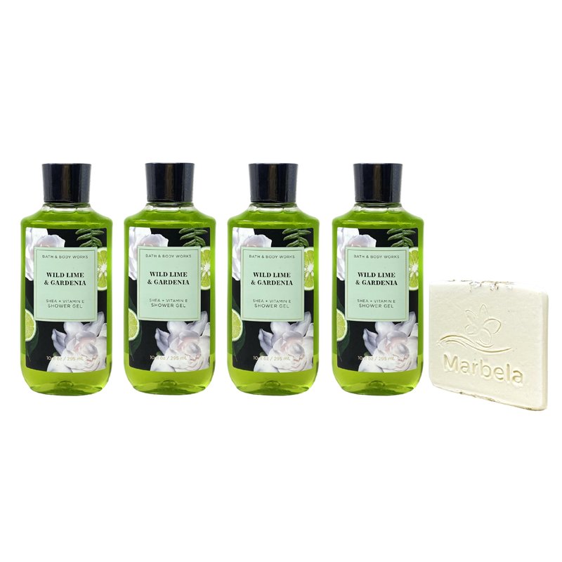 Bath & Body Works Wild Lime & Gardenia Shower Gel Value Pack with a Marbela Natural Oats Sample Soap. INCLUDES: 4 Shower Gels (10 fl oz / 295 mL each) and a Marbela Natural Oats Sample Soap. Wild Lime & Gardenia - Fragrance Notes: A sunny blend of bright, citrusy bergamot, fresh gardenia blooms, and warm musk. Marbela Sample Soap - While ordinary soaps dry out your skin, Marbela specializes in all-natural, moisturizing soaps and bath products that will take your self-care routine to the next level. The priority is to create products that are all-natural, vegan, cruelty-free and most importantly, handmade with love.