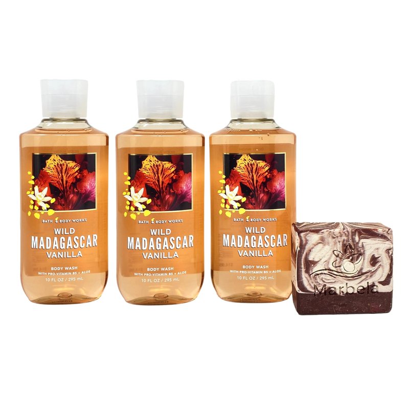 Bath & Body Works Wild Madagascar Vanilla Body Wash Set with a Marbela Cherry On Top Bar Soap. INCLUDES: 3 Body Washes (10 fl oz / 295 mL each) and a 4 oz Marbela Cherry On Top Bar Soap. Wild Madagascar Vanilla - Fragrance notes: Wild Madagasscar Accord, African Pear, and Wild Jasmine. Marbela Cherry On Top Bar Soap - Grab a bowl, throw some bananas in the bottom with scoops of your favorite ice cream on top. Drizzle your ice cream with chocolate and caramel sauce and finally save the very best two ingredients for last. Whip cream dollops on top of the ice cream tower and add the cherries right on top. Scent: Cherry, Vanilla, Strawberry.