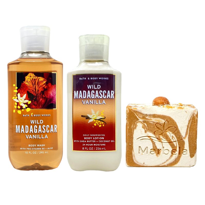 Bath & Body Works Wild Madagascar Vanilla Gift Set - Body Wash and Body Lotion - with a 4 oz Marbela Peach Gardenia Bar Soap. (Ingredients: Saponified Oils of: Olive Oil, Organic Virgin Coconut Oil, Shea Butter, Castor Oil, Kaolin Clay, Fragrance, Vitamin E & Mica).