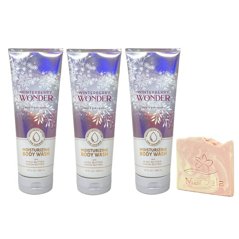 Bath & Body Works Winterberry Wonder Moisturizing Body Wash Bundle with a Marbela Himalayan Salts Springs Sample Soap. INCLUDES: 3 Moisturizing Body Washes (10 fl oz / 296 mL each) and a Marbela Himalayan Salts Springs Sample Soap (Soap May Vary). Winterberry Wonder - Fragrance Description: A sweet snowfall of ruby frost winterberry, sparkling cranberry and crystal vanilla. Marbela Sample Soap - While ordinary soaps dry out your skin, Marbela specializes in all-natural, moisturizing soaps and bath products that will take your self-care routine to the next level. The priority is to create products that are all-natural, vegan, cruelty-free and most importantly, handmade with love.