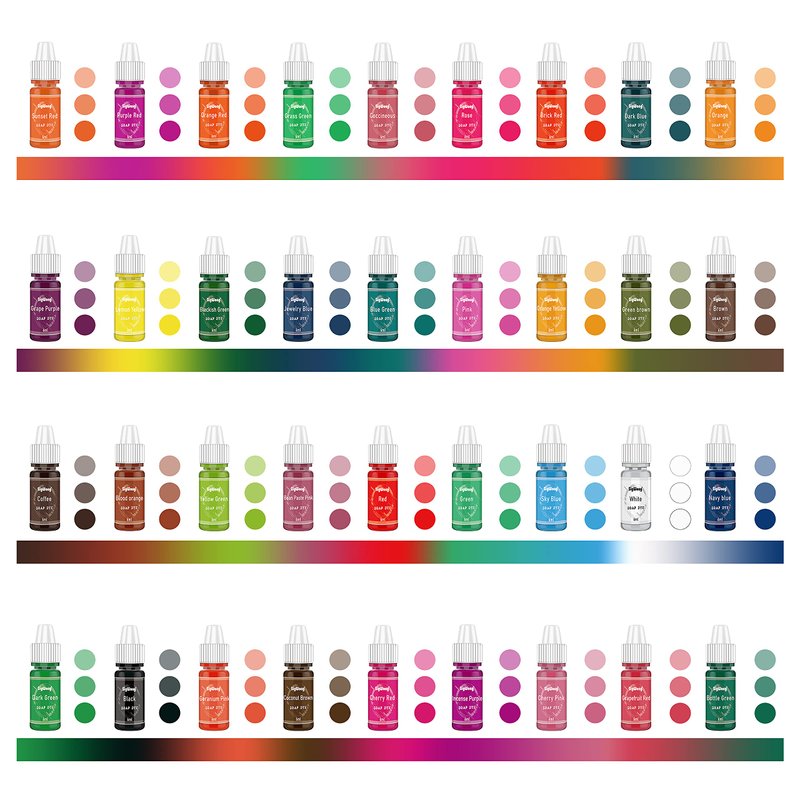 - STUNNING COLORS - This soap colouring set includes 36 colours: red, grape purple, grass green, orange red, blue green, incense purple, lemon yellow, brown, yellow green, pink, teal, etc. Each soap dye is 6ml/0.2 fl.oz