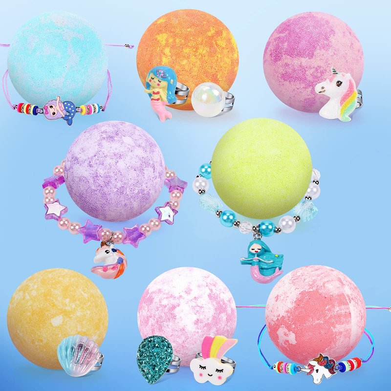 - BATH BOMBS WITH SURPRISE INSIDE -- Our kids bath bomb gift set includes 8 different colored ball-shaped bath bombs with jewelry inside. Once the bath bomb fully dissolves, the surprised unicorn mermaid bracelet or ring will float in a small plastic container, make it easier for kids to find. To create more surprises, two of these bath bombs are designed to contain two toys, while the others only contain one. You can imagine how your little one will be excited about the toy he or she will find!