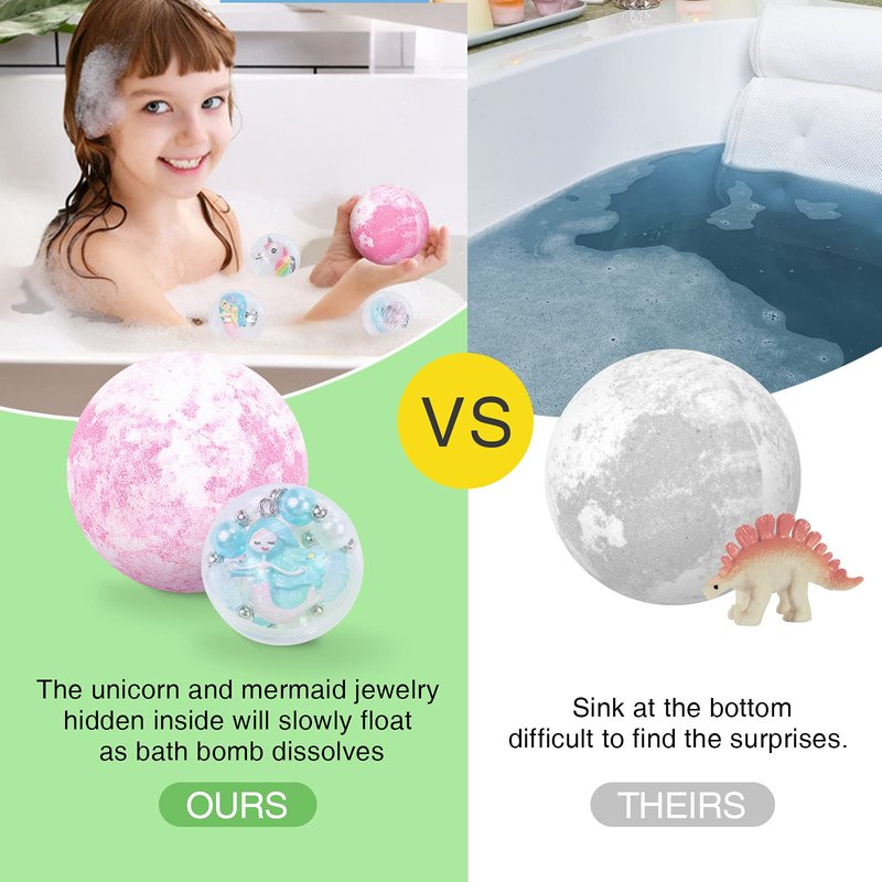 BATH BOMBS WITH SURPRISE INSIDE -- Our kids bath bomb gift set includes 8 different colored ball-shaped bath bombs with jewelry inside. Once the bath bomb fully dissolves, the surprised unicorn mermaid bracelet or ring will float in a small plastic container, make it easier for kids to find. To create more surprises, two of these bath bombs are designed to contain two toys, while the others only contain one. You can imagine how your little one will be excited about the toy he or she will find!