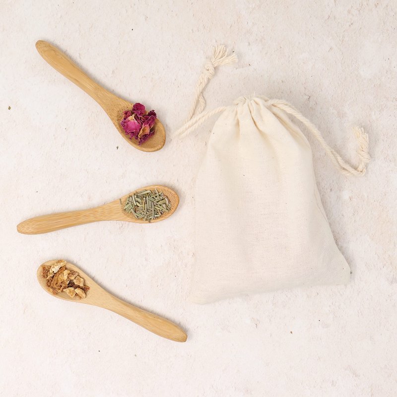 - INCLUDED IN THE KIT:Instruction book, Reusable drawstring cotton infusion bag, Wooden scoop Epsom salts, Himalayan pink salt, Fine cut oats, Rose Petals, Citrus Peel, Marigold Flowers, Peppermint, Rosemary.
