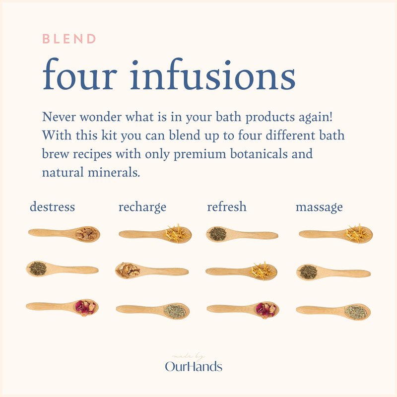- MAKE YOUR OWN BATH BREW INFUSION: Never wonder what is in your bath products again! With this kit you can blend up to four different bath brew recipes with only natural botanicals and minerals. Sit back and relax with the certitude that your bath contains no harmful ingredients for you or the planet.