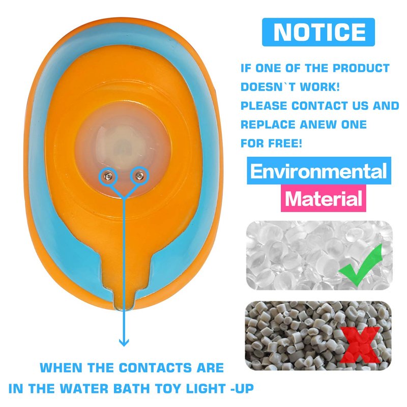 - The light up bathtub toys are made of rubber that will float on water, there are 2 Sensors at the bottom, it will light up auto when put it on water, ideal gifts for baby playing in the bath room.