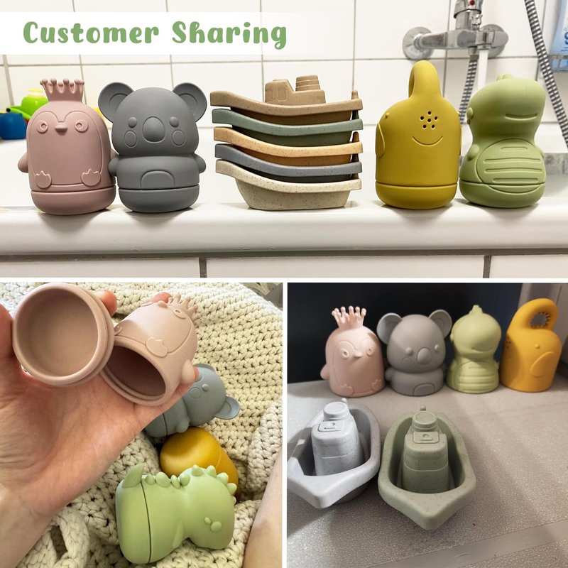 - Maximum Squirting Fun - Product inlcudes 4 silicone animals (elephant, koala bear, dinosaur, and penguin) and 5 plastic bath boats, squeeze and squirt these soft cute animal bath toys for extra fun in the water. Mix and match the tops and bottoms for creative and inventive play. These toddler bath toys could float perfectly and are easy to grab, ideal for infants 6-12 months and toddlers 1-3 years of age.