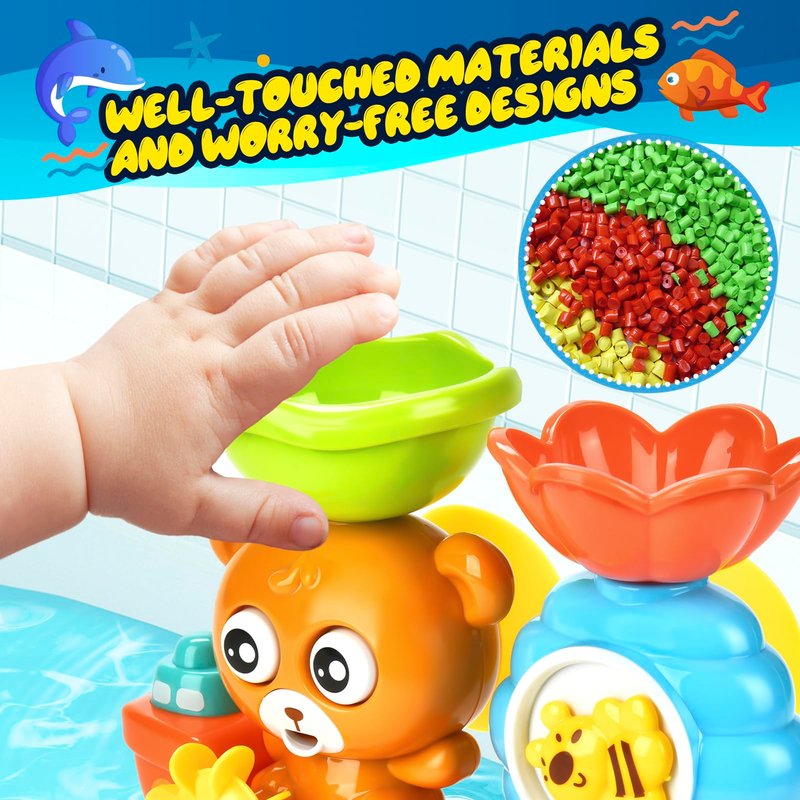 - 【Various Animal Themed Bath Toy Set】: The bath toys set includes 1pcs bear waterfall bath toys, 2 pcs swimming turtle water toys, 3pcs fish, 1pcs fishing pole, 3 animals shape rubber ring, 1pcs fishing net and 2 pcs cups, totally 13pcs packed in one gifted box, providing the endless fun to your children during the bath time. These bath toys set satisfied differnent ages kids, great for in or out of the water, such as bathtub, pool, beach or on the floor.