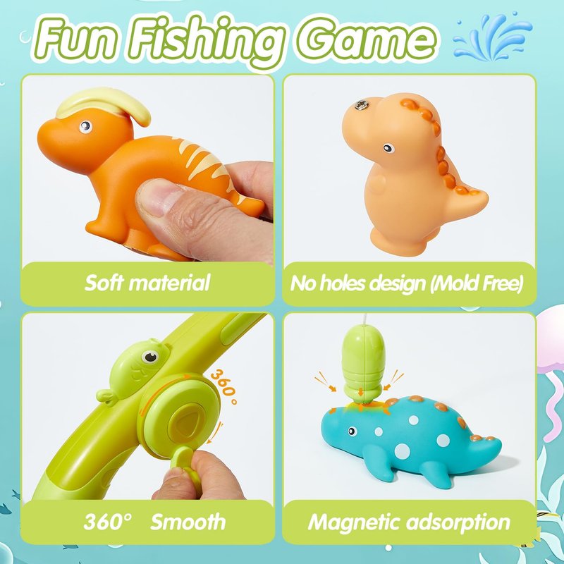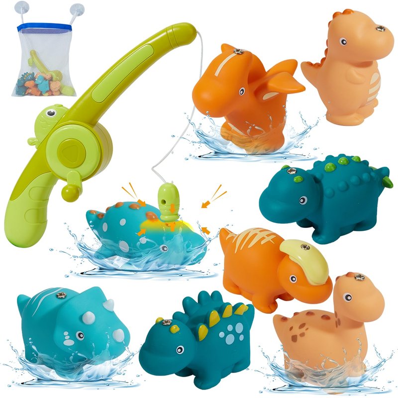 - Dinosaurs themed fishing toy set includes: toddler bath toy set contains 1 magnetic fishing rod and 8pcs magnetic Soft Rubber Dinosaurs floating toys,Characters float with magnets on top for easy fishing. Magnetic fishing hook easily picks up dinosaurs toys, and the handle is specially made to fit toddler hands.