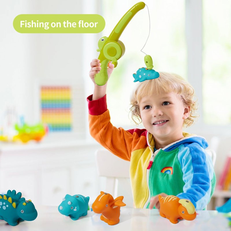 - Fun Magnetic Fishing Games: kids can rotate the turning rod to adjust the line to fishing and experience the simulated fishing joy. There is a nail on the head of the dinosaurs, just aim at it, and the magnetic device of the fishing rod can easily attract the fish. Let the baby cultivate an interest in fishing and also exercise the baby's hand-eye coordination ability.