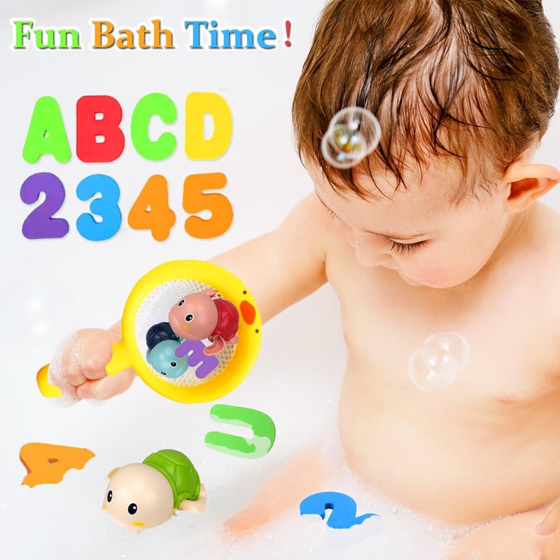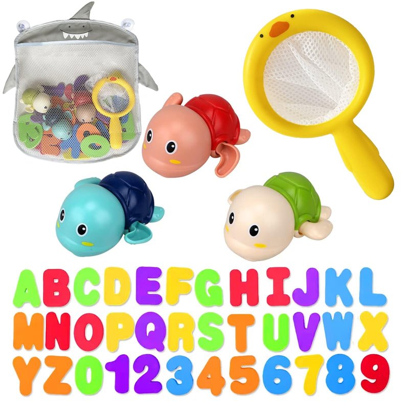 - 【Cute Wind-up Bath Toys Set】: This luxury baby bath toy set contains 26*Bath Letters(A-Z) & 10*Numbers(0-9) + 1*fishing net + 3*Wind-up Toys + 1*Mesh Organizer+ 2*Ultra Strong Hooks+2* Suction cup. with cute design and bright colors.This set will make your baby love bathing.
