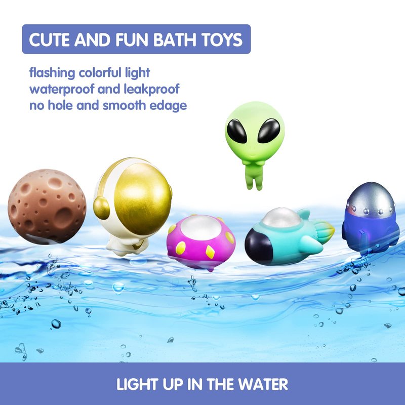 - 6 pieces pack of light-up bath toys featuring a space theme, including cute and funny astronaut, rocket ship, aliens, UFO, space ship and planet.