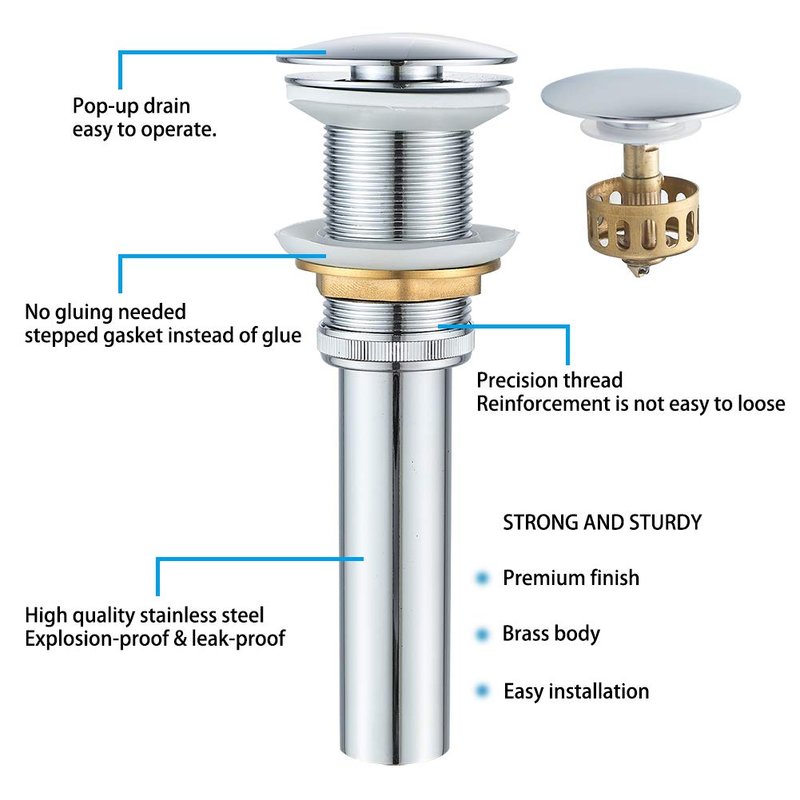 - METAL BODY: Pop-up drain stopper, drain flange, threaded pipe are made from brass, tailpiece is made from stainless steel. All metal construction for maximum durability. Industy-leading finish is corrosion & rustproof.