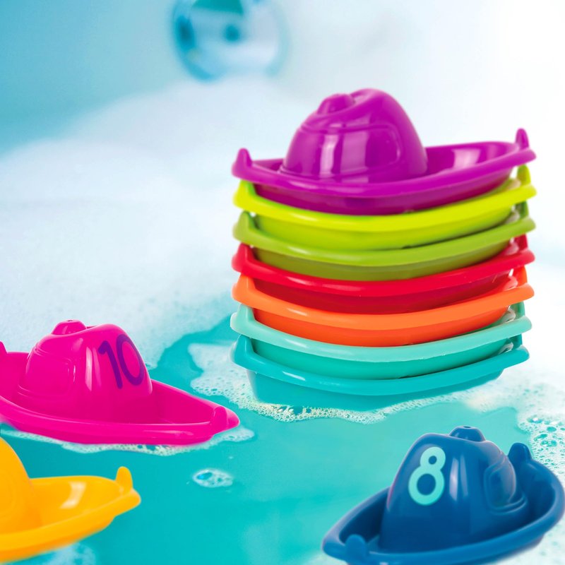 - 10 Bath Boats: This colorful play set includes 10 stackable and tiny hands-friendly boats that float and connect!