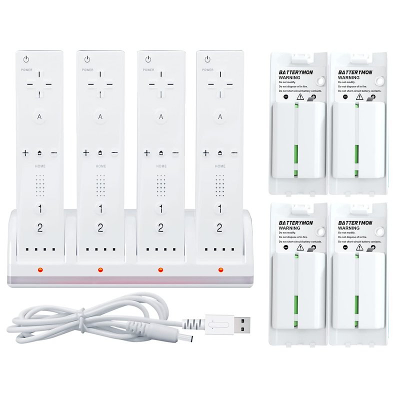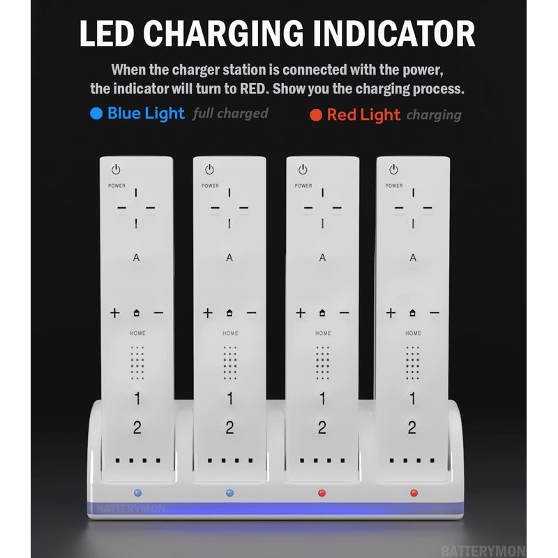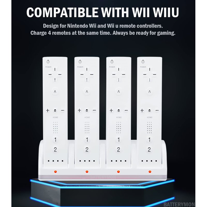 - 4-in-1 Charging Station: Allow you to charge 4 Wii / Wii Uremotes at the same time, and no need to remove the batteries. The USB port charging cable will be convenient for you to connect power.