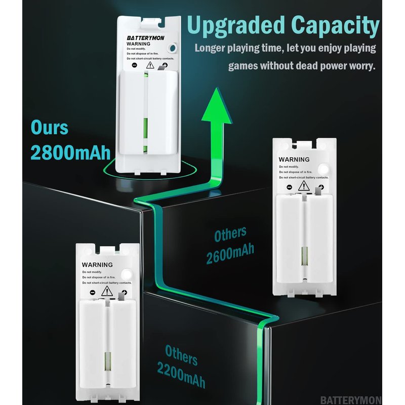 - High Capacity Battery: The package comes with 4pcs 2800mAh rechargeable battery packs. Exclusively designed for the Wii Remote Controller. The battery life is longer then the standard AA battery.