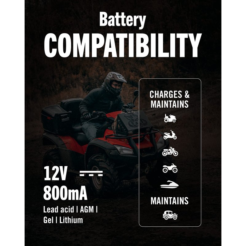 - STAY CHARGED: 12V Battery Charger, 800mA Selectable Lead Acid/Lithium Battery Charger It will keep your battery fully charged so that it is ready to go when you are