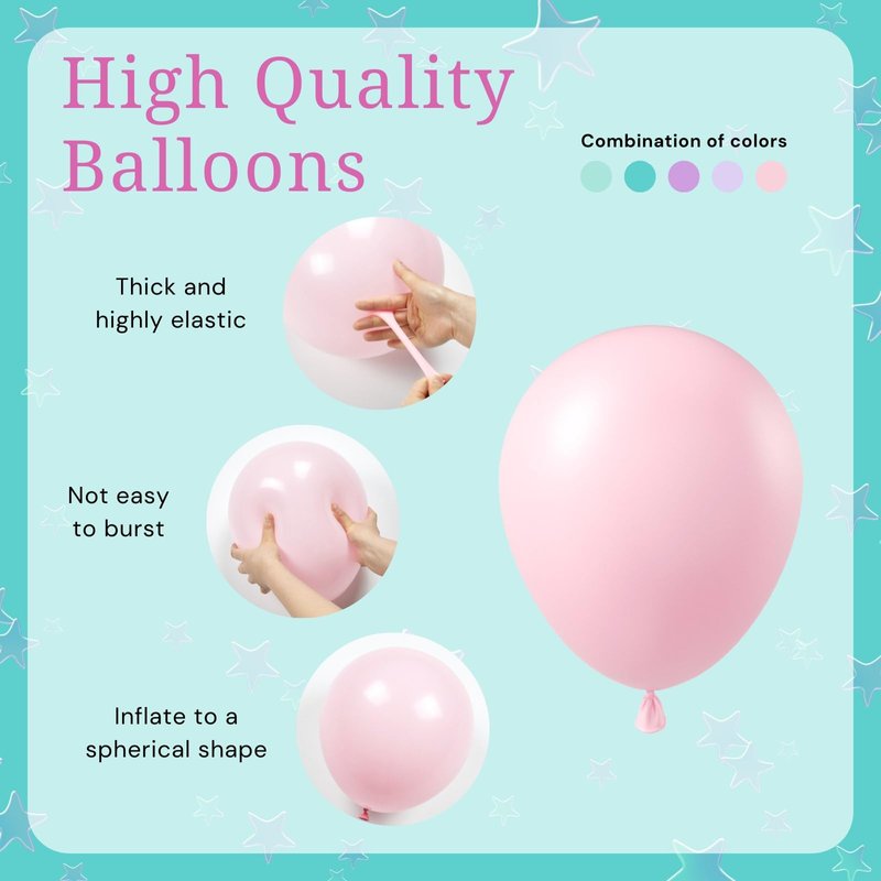 • Package Include: 60pcs 12 inch mermaid balloons (metallic purple balloonsx12, metallic green balloonsx12, pastel purple balloonsx12, lake blue balloonsx12, light pink balloonsx12 ), 1pcs glue dots, 2pcs white ribbons