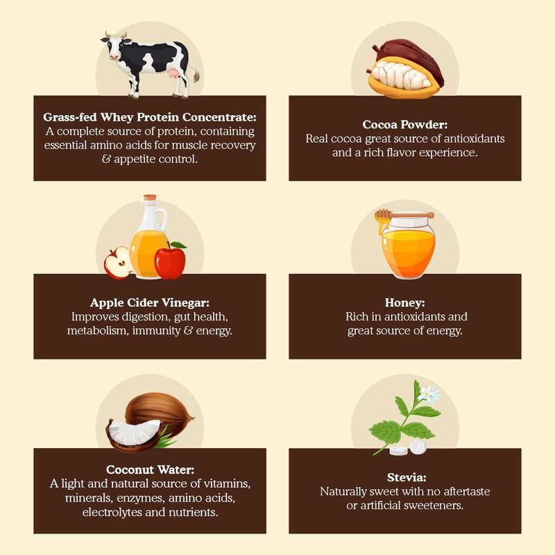 Made from 100% all natural quality Wisconsin-sourced whey protein isolate that absorbs easily, you will find that whether you want to lose weight, or looking for a convenient way to replace a high quality meal, you will love the silky smooth taste of our shakes. Our Cocoa Cream is made with real cocoa powder, a great source of antioxidants with no chemical or artificial flavorings, all-natural stevia and honey for the right amount of sweetness, hormone/antibiotic free yogurt for a creamy and silky experience, coconut water for additional creaminess and apple cider vinegar for a chemical free natural energy boost without the crash.