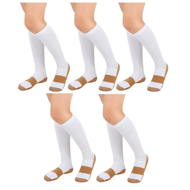 Bcurb Graduated Compression Socks (5 Pair) Calf High Men Women Support Stocking. (White/Gold, Small/Medium)
