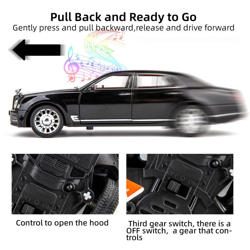 Product features: Third gear switch; 4 doors,hood,the trunk can be opened;The Bentley logo can be hidden; LED lighting; High simulation car sound; Pull back car