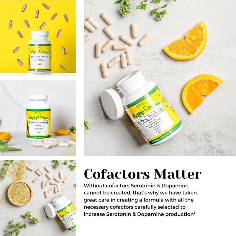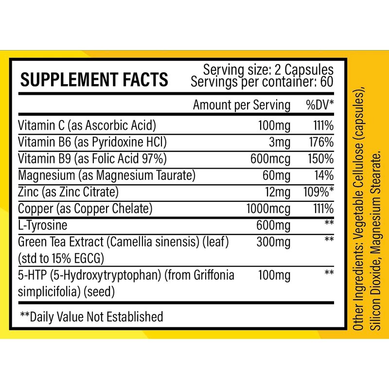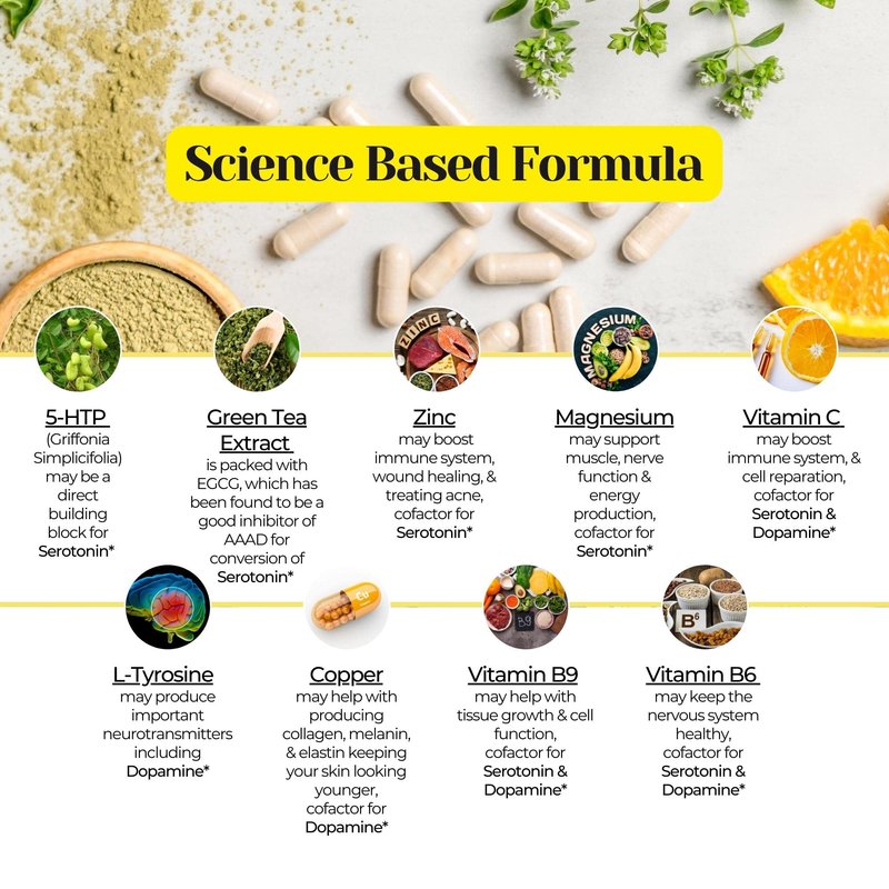 - Made in the USA - GMP Compliant, FDA Registered Facility; Potent Serotonin Dopamine Booster - 5-HTP and L-Tyrosine are the precursors to Serotonin and Dopamine; 7 Necessary Cofactors for Conversion - Cofactors are needed for Serotonin and Dopamine conversion, without them conversion will not happen ; Stress Mood Support - 5-HTP is the precursor to the happiness hormone Serotonin. It may promote mood, sleep, weight loss, and help with migraines ; Focus and Energy - L-Tyrosine is the precursor to the feel good hormone Dopamine. It may enhance memory, focus, and increase energy and exercise performance ; Unit count: 120.0 ;