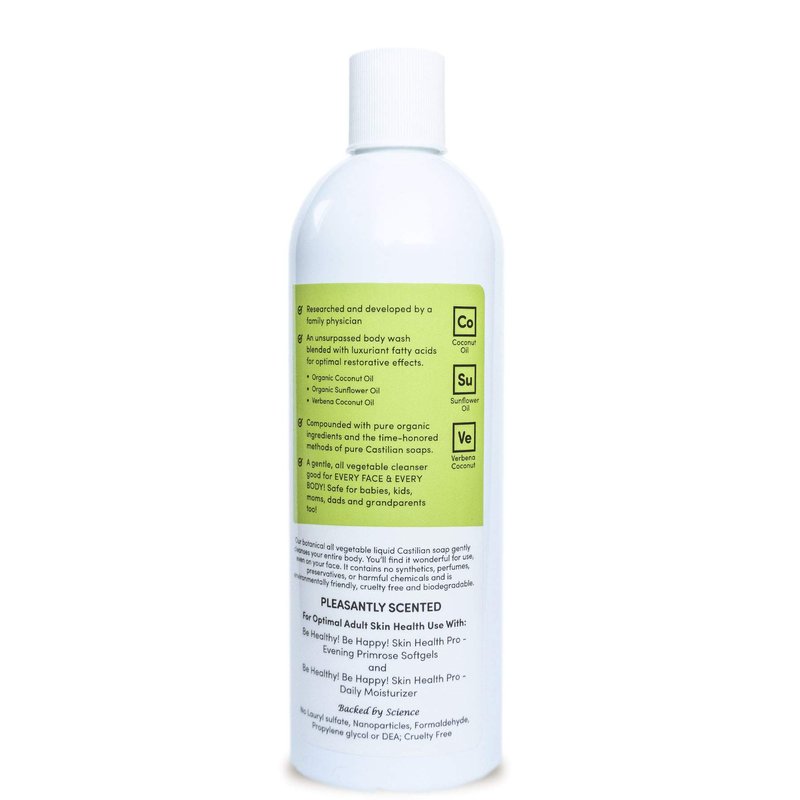 Castile soap is said to have its origins in the 8th century when soap artisans and merchants from Aleppo, Syria journeyed across the Silk Road into Persia, the Middle East and beyond. During the 11th century, Crusaders discovered the revolutionary benefits of Aleppo soaps and, upon returning to Europe, brought with them the secrets for making these luxuriant cleansers. Known for its rich, abundant olive oils and Castilian attention to time honored methods, Castile, Spain became the European center for the soap that bears its name to this day. Welcome to Be Healthy! Be Happy! Skin Health Pro - Luxuriant Body Wash, an all-vegetable, all-body botanical skin cleanser! We blended this unsurpassed body wash with luxuriant essential fatty acids for optimal restorative effects. Formulated with organic sunflower and coconut oils and infused with Verbena coconut, Skin Health Pro – Luxuriant Body Wash, rivals the finest skin cleansers available worldwide. Its compounded with rich organic ingredients and the time honored-methods of pure Castilian soaps. A gentle, all vegetable cleanser good for every face & every body! Safe for babies, kids, moms, dads and grandparents too! Exclusively formulated ingredients: Organic Sunflower Oil, Organic Coconut Oil, De-ionized Water, Kosher Vegetable Glycerin, Guar, Citric Acid, Organic Castor Oil, Organic Rosemary, and Verbena Coconut Oil. Be Healthy! Be Happy! Skin Health Pro - Luxuriant Body Wash is manufactured in the USA in strict accordance with Good Manufacturing Practice standards. Directions for Use: apply liberally to hands, sponge, or cloth; moisten with water and wash. Rinse thoroughly; towel dry. For optimal skin health use in conjunction with Skin Health Pro - Daily Moisturizer and Evening Primrose Softgels. For questions or comments email us at: info@behealthybehappy.com Avoiding exposure to harmful sunlight, consuming diets high in essential fatty acids and rejecting tobacco products promote youthful, healthy skin.