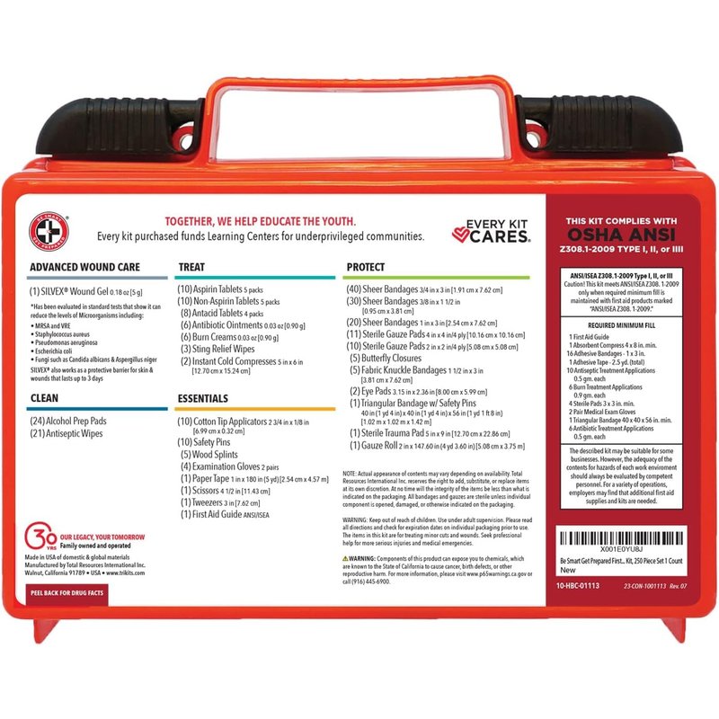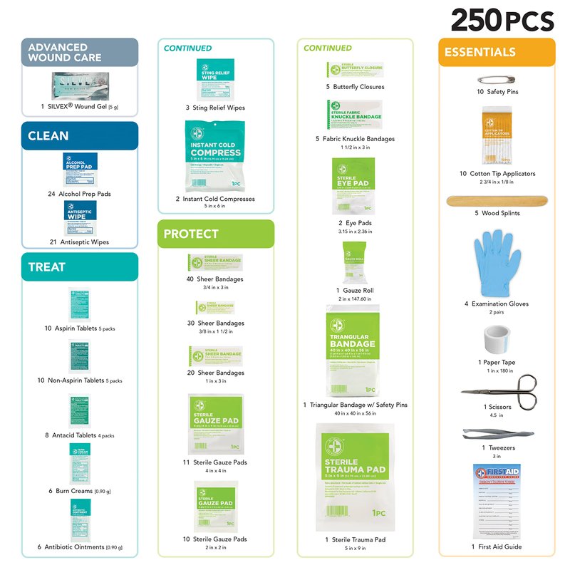 - 250 pieces of comprehensive first aid treatment products. Manufactured by the leading manufacturer of First Aid Kits in the USA.