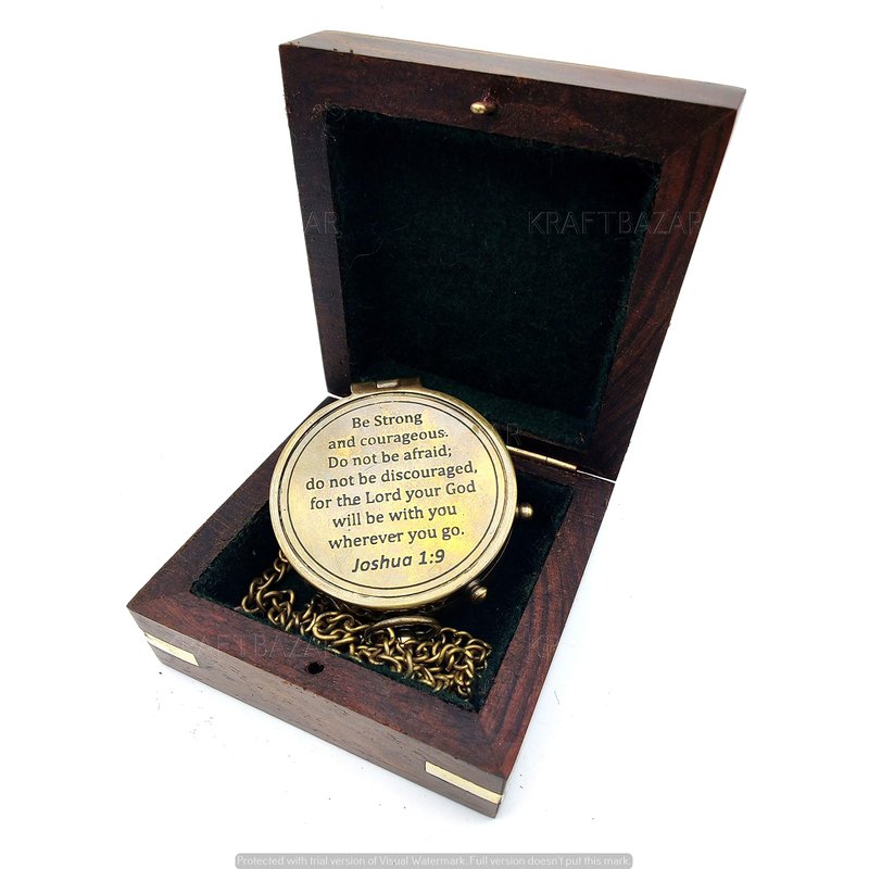 - BEAUTIFULLY CRAFTED - Antique brass compass is corrosion resist, packed in a hand stitched imprinted Rosewood Storage case & a Chain with Engraved Famous Quote "Be strong and courageous, do not be afraid; do not be discouraged, for the Lord your God will be with you wherever you go". Under the Tough Glass Cover Is A Beautiful, Detailed Brass Compass Which Will Help You Find and Navigate Your Way Home.