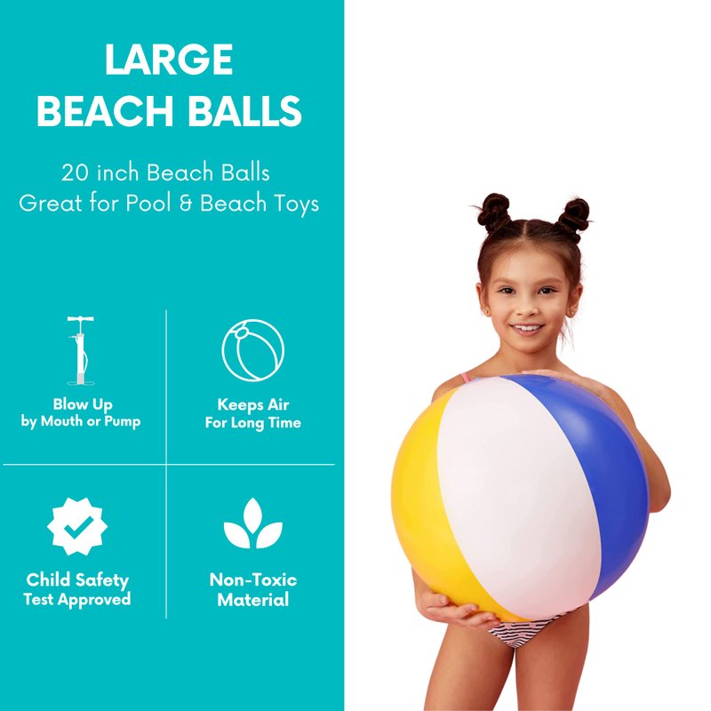 Pack of 3 inflatable beach ball 20" #1 Rated Pool Toys For Kids. Perfect for a pool party, beach, summer party favor. High quality & durable. Child Inflatable Beach Balls made of highest quality material. POOL/BEACH TOYS: Perfect for pool toys for kids & adults, beach toys for Kids boys & girls, sand toys, swimming pool floaties, backyard pool party decorations, summer floating toys for outdoor water games and activities, inflatable pool floats for toddlers to splash some water, beach toys for kids 3-10 & teens. PVC PREMIUM QUALITY: Our big beach balls for kids are made of PVC, Holds air long.The seams on the huge water ball were well sewn, durable and high-strength, Designed for long-time use. KIDS FAVORITE: The kids will have a great time kicking & Bouncing these pool balls. Great beach toys for toddlers. Soft enough that they cant hurt anyone or anything, Favorite summer toy for indoor & outside playground ball fetch play, also great for beach ball party decorations & Luau Hawaiian themed tropical party supplies & rainbow party decor