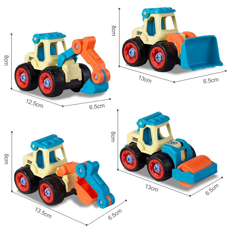 - 【Product Function】 Its wheels are movable, and it can slide forward and backward with a slight push. The hands of the truck can move up and down, among which the excavator and the ground drill have three movable joints. Digger and Bulldozer can hold small things like dirt and sand. It can also be disassembled and assembled by tools.