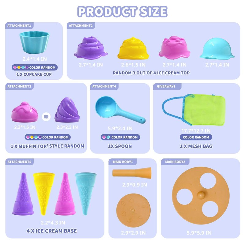- All-in-one Super Value Sand Toys set:Cute ice cream sand playset includes 14 pieces beach sand toys: 1 ice cream cup, 3 ice cream top, 1 muffin top (style random) , 1 spoon , 4 ice cream base, 3 main body and 1 mesh beach bag ( ALL COLOR RANDOM )