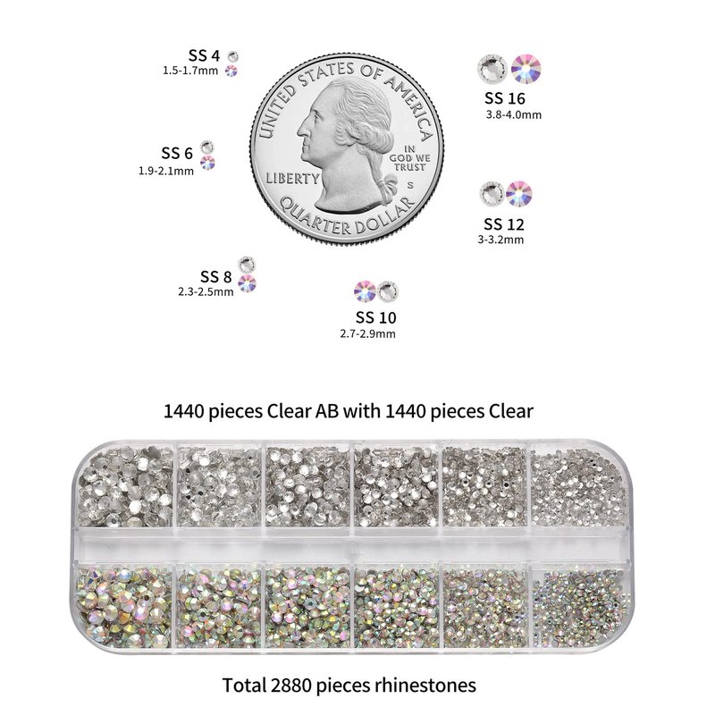 - This 2800pcs flatback rhinestones kit with tools including 1440pcs crystal rhinestones and 1440pcs crystal ab rhinestones in 6 sizes, 1 pcs tweezer and 1 pcs pick pen.