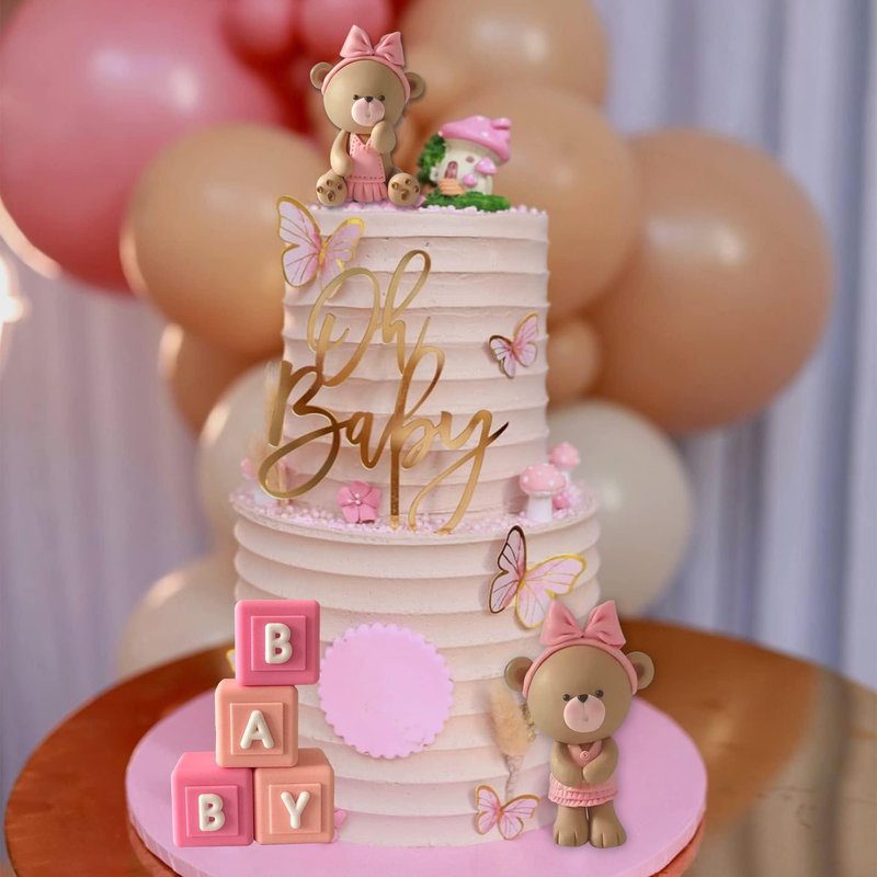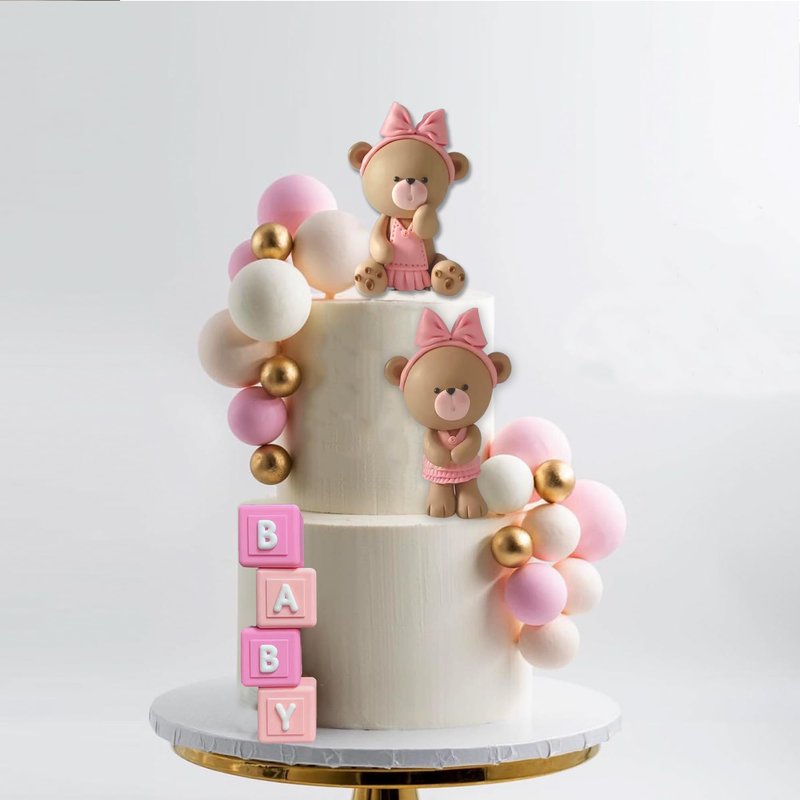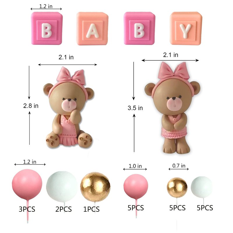 - PACKAGE - The bear cake decoration includes 2 pieces bear cake toppers, 6 pieces gold ball toppers, 8 pieces pink balls toppers, 7 pieces white balls, 4 pieces BABY letter square cake decorations.