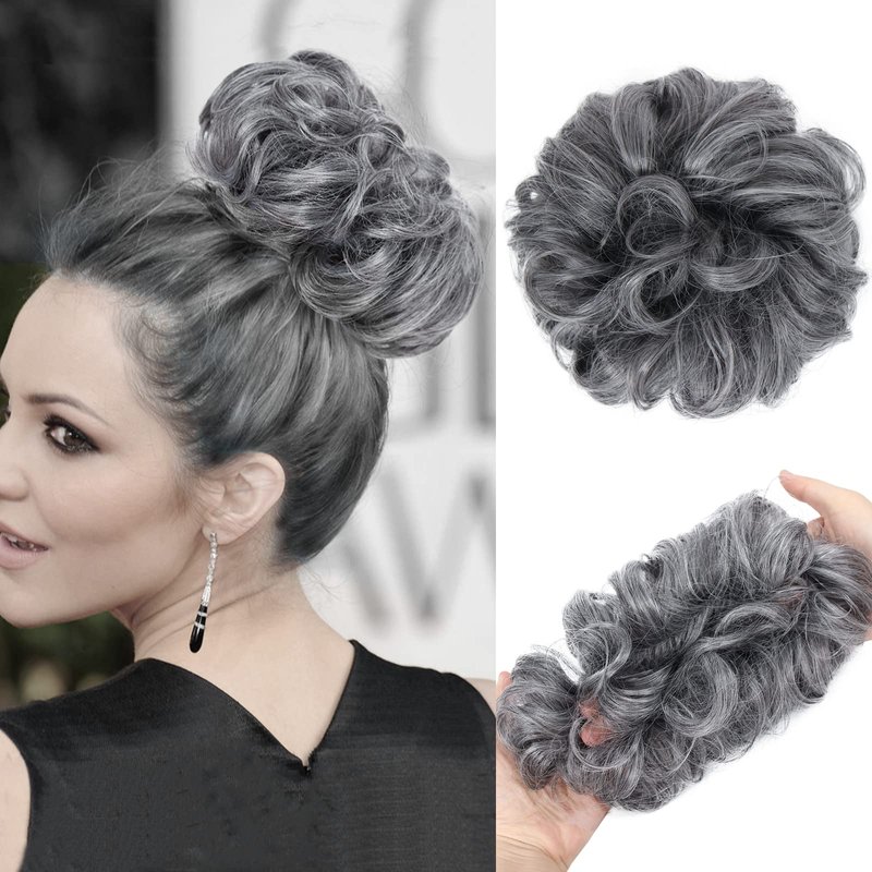 BEAUEXE Thick Volume Messy Bun Hair Scrunchies Curly Hair Extensions for Women Create Full Updos Realistic Synthetic Hair Bun Maker Chignon Ponytail Extension (Silver Gray Black Mixed),1.0 Count