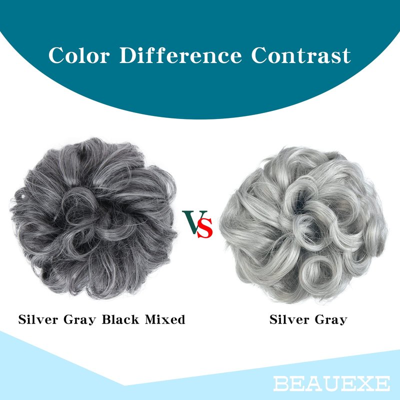 BEAUEXE-Professional beauty manufacturing experts. Each of our products like process to more beautiful you.Specification:Brand:BEAUEXEProduct Name: BEAUEXE messy hair bunProduct Size: Width:7",Height:3.5" After fully extendedProduct Weight: Approx 1.94 OZ(55 Gr)Product Color: Silver Gray Black MixedProduct Style: Curly bun maker for hairProduct Material: Premium synthetic heat-resistant fiber/ Elastic bandPackage included: 1PCS Messy hair bun hair scrunchies for women's hair+resealable bagHow to use: Open it then shake it after receiving. If needed, secure with bobby pins.(Due to transportation and storage, the product may not look good in shape. )How to care: 1 Wash with warm or cold water, No hot water,it'll damage the curly bun for hair2 Add a little shampoo, conditioner wash gently3 Let it air dry.Do not dye, twist, wring, squeeze your short hair extensions.Tips: Color may vary due to the difference between the display or lighting , Please in kind prevail.