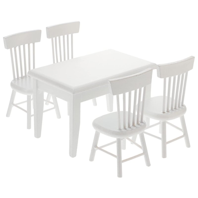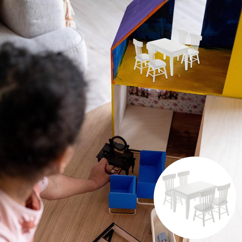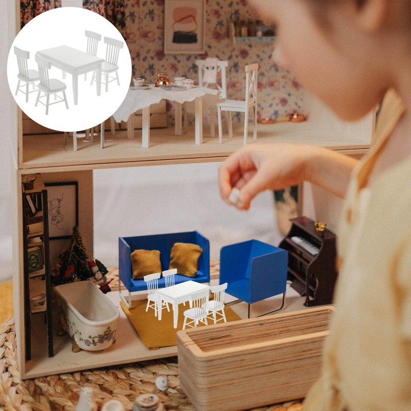 This dining table and chair model set has been carefully designed and made to provide your child with the best family companion for all- day play. There are four chairs in the imitation big table, each with a hollow on the back, which is very fashionable and fashionable. This table model set is a great miniature furniture for the living room of your dollhouse, and a great decoration for your indoor model.