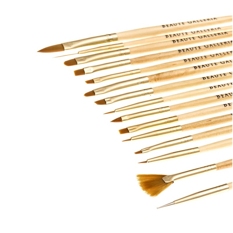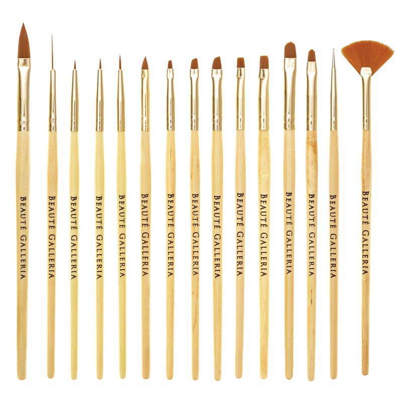 BEAUTÉ GALLERIA 15pcs Nail Art Brush Set is ideal for fine work to draw lines, detailing flowers or creating special patterns. This nail art brush set will help you create hundreds of different designs including dots, swirls, lines, flowers and anything you like. Perfect for professional nail salons and DIY high-quality nail art at home. Great for all kinds of acrylic nails and French nails.Beaute Galleria 15pcs Nail Art Brushes With Wooden Handles - 5x Gel Brushes ( 3x Oblique Gel Brushes, 2x Flat Gel Brushes ) - 3x Oval Gel Brushes- 3x Painting Brushes - 1x 3D Brush - 1x Dotting Tool - 1x Fan Brush - 1x Liner Brush.