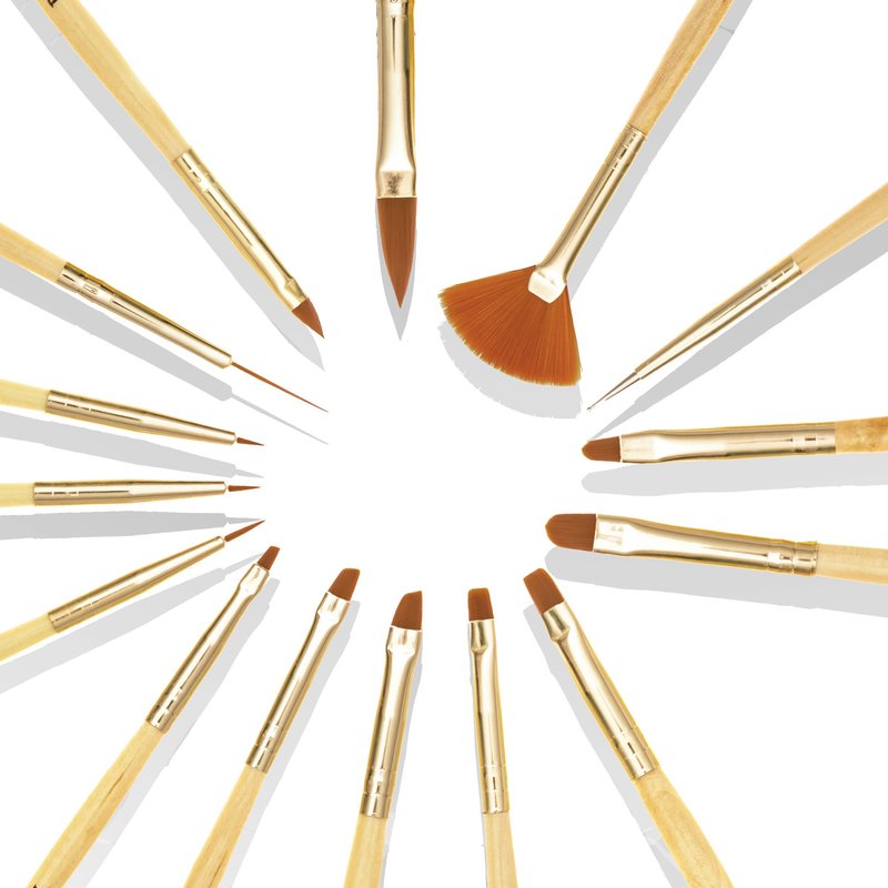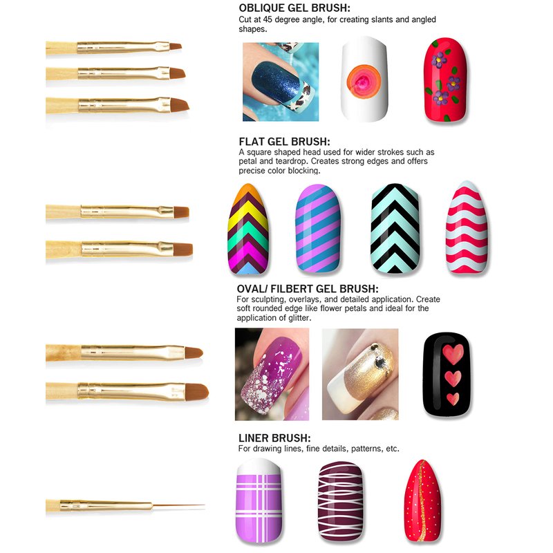 - [15PCS NAIL BRUSHES] Includes 5x Gel Brushes ( 3x Oblique Gel Brushes, 2x Flat Gel Brushes), 3x Oval Gel Brushes, 3x Painting Brushes, 1x 3D Brush, 1x Dotting Tool, 1x Fan Brush, 1x Liner Brush for nail art effect.