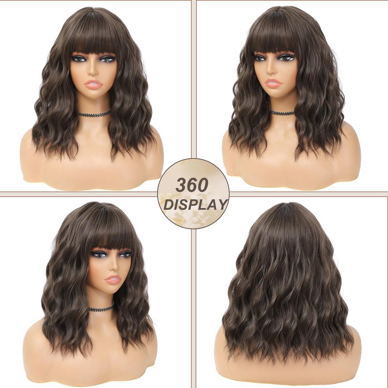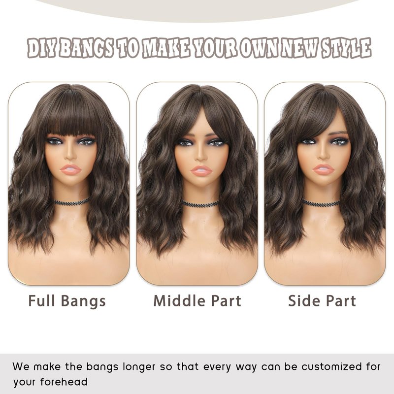 BEAUTIFA Brown Wig with Bangs for Women 14 Inch Shoulder Length Short Bob Wavy Curly Wig Natural Brown Wig Heat Resistant Synthetic Wigs