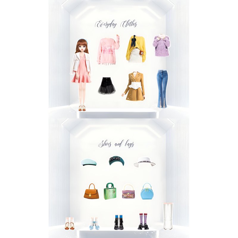 4. Each set contains 1 magnetic paper dolls, 4 magnetic clothing patches, a set of acrylic base holders and a random postcard.