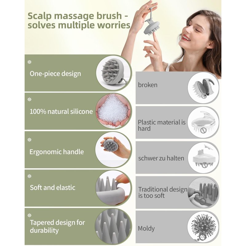 - 🏆ONE-PIECE SILICONE SCALP BRUSH:The one-piece structure is more durable, and our shampoo brush will not accumulate dirt or fall apart like other products. It is completely waterproof and convenient for use in the bathroom. It does not accumulate moisture and does not breed mold. Even if your scalp is sensitive and red, this hair brush is suitable for you.
